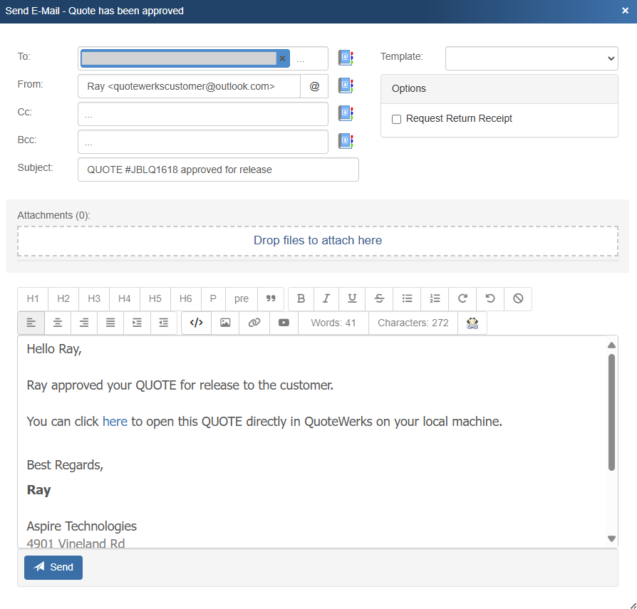 Once the document has been approved the next time the user opens the document in QuoteWerks a message box will appear notifying them that the document was approved.