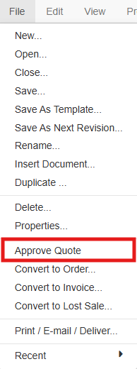 The document can be approved by clicking on the File-> Approve Quote menu option.: