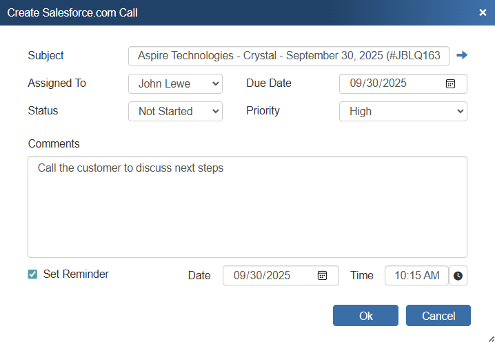 Here, you can adjust information about the call such as who it's assigned to, the status, due date, priority, as well as add comments, and set a reminder for the call.