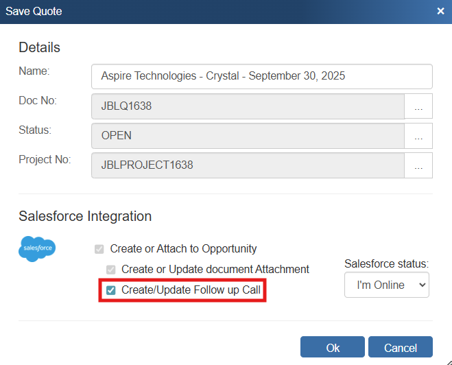 When you save a quote, the Create/ Update Follow Up Call checkbox will appear on the Save window.
