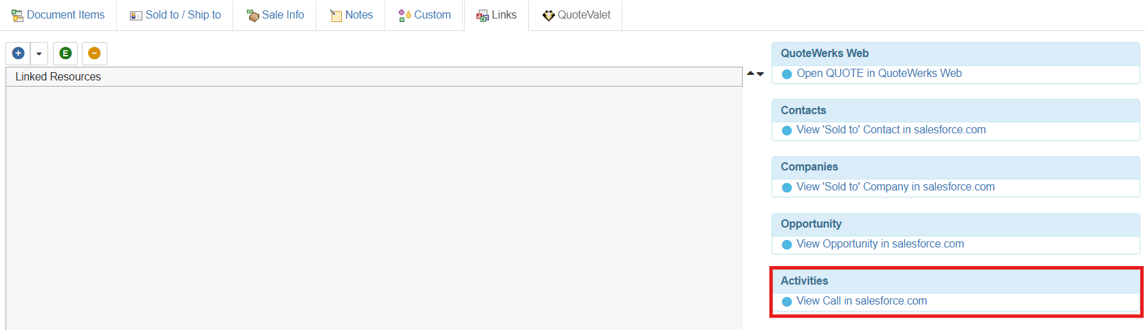 The follow-up call will also be available on the Links tab of the quote in QuoteWerks. This is a quick shortcut to the call in salesforce.com.