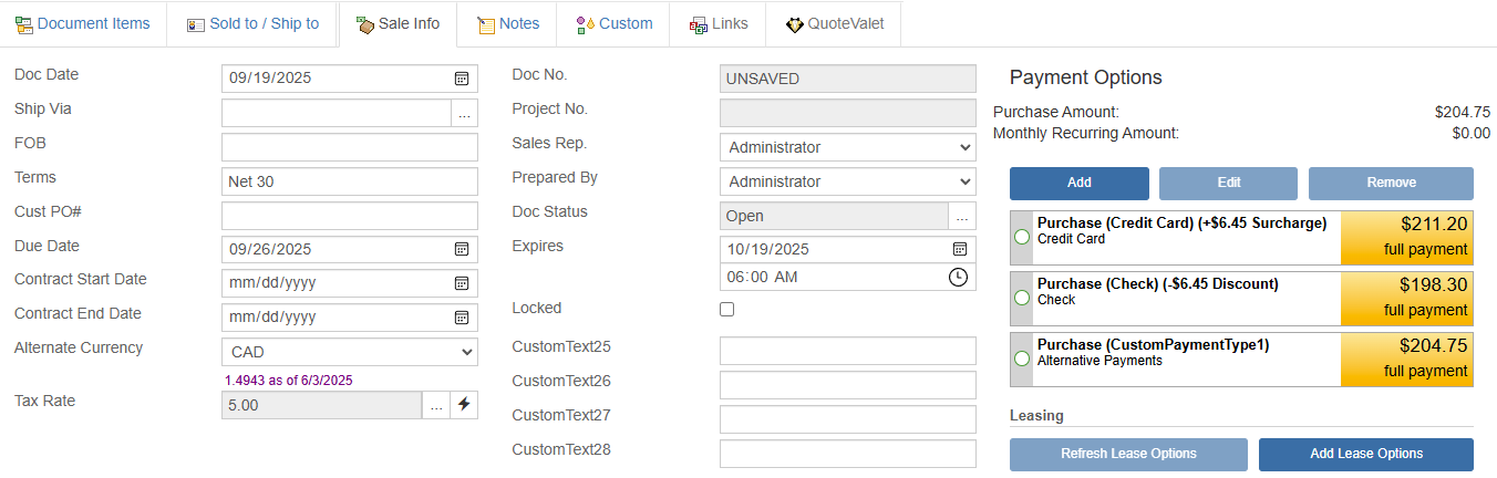 10. Now that we have our contact and product on the quote, we want to make sure that we configure other settings, and this is done on the sale info tab. Here we can set shipping method, terms, contract dates, tax rate, payment options, expiration date, and more.