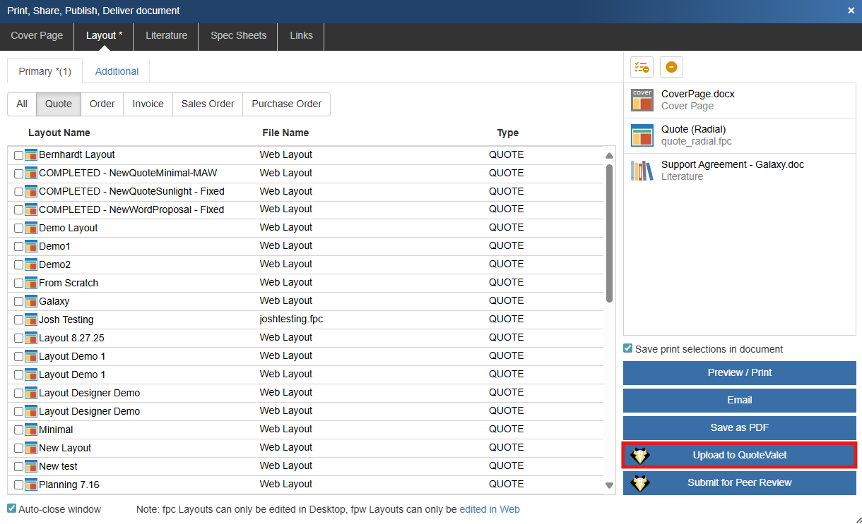 13. To deliver this quote through QuoteValet click on Upload to QuoteValet.