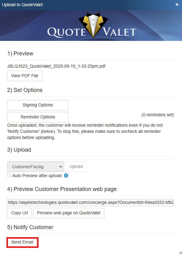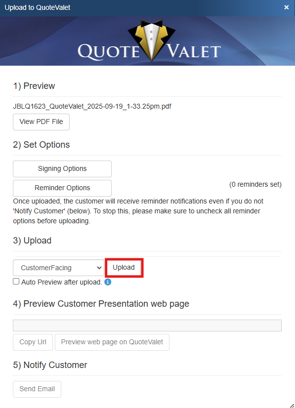 14. This opens the upload to QuoteValet window. Here you can preview the PDF attachment as well as set signing options and reminder options. To upload your quote to the QuoteValet server, click on upload.