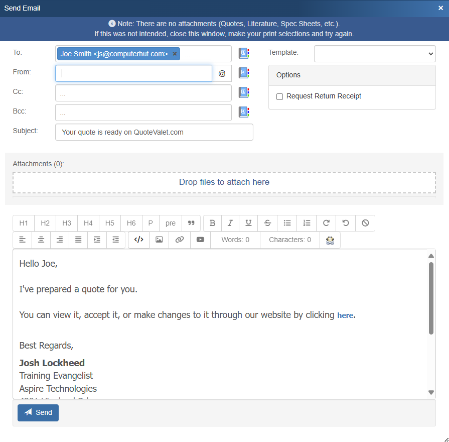 15. Once the quote has been uploaded, we can click on send email to send this to the customer from within QuoteWerks and without having to use an external email system. This email includes a link to the QuoteValet quote and is sent from the email of the sales rep preparing the quote.