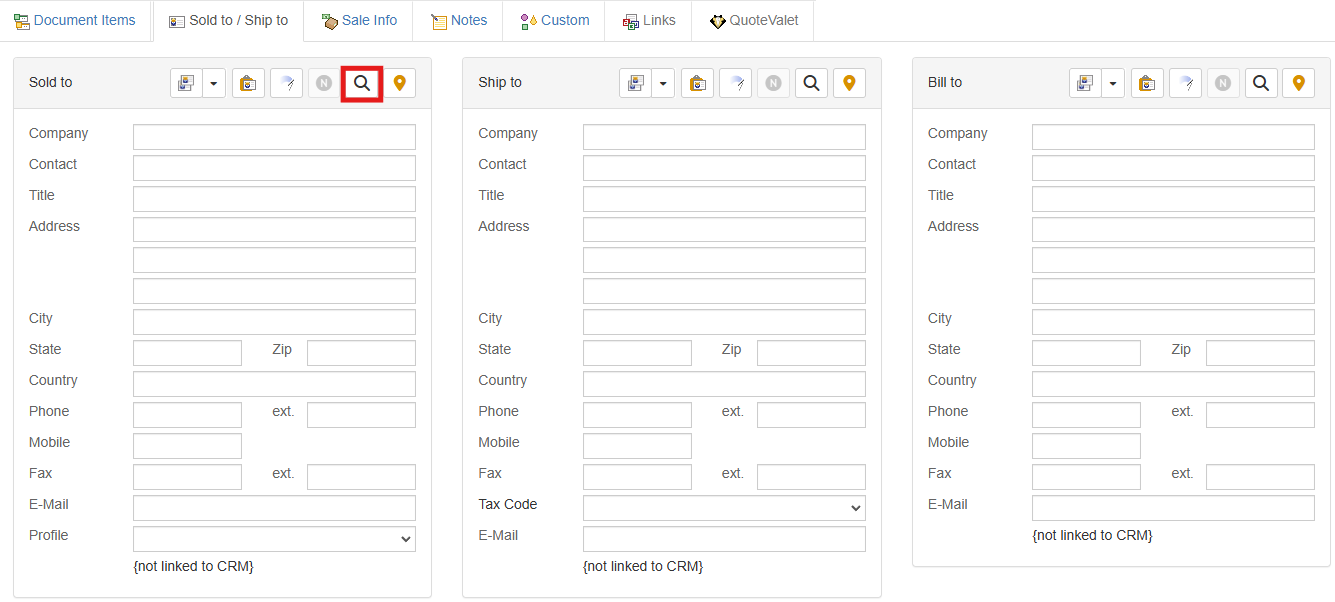 3. Once in the sold to ship to tab, click on the magnifying glass to search for a contact. This opens the find contact window. This searches your CRM, PSA, or the native QuoteWerks contact database depending on how you have things set up.