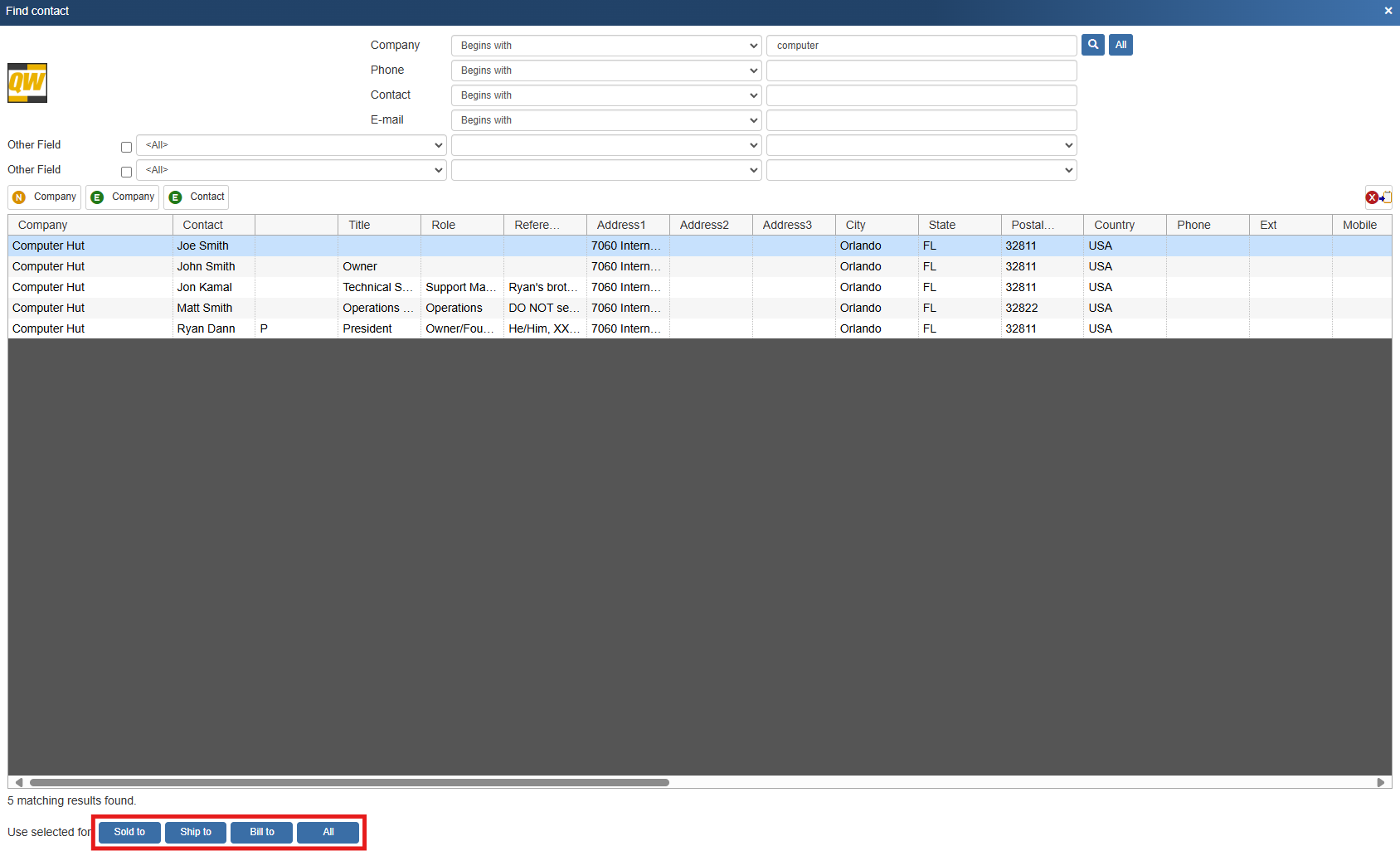 4. Search for the contact you wish to use and either double click or select them and hit the sold to, ship to, bill to or all button on the bottom of the window.