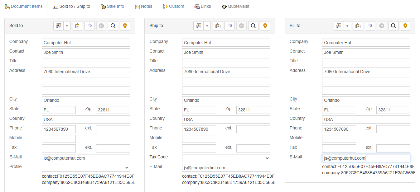 5. When we close out of the find contact window, we can see that our contact has been added to all sections of the sold to/ship to tab.