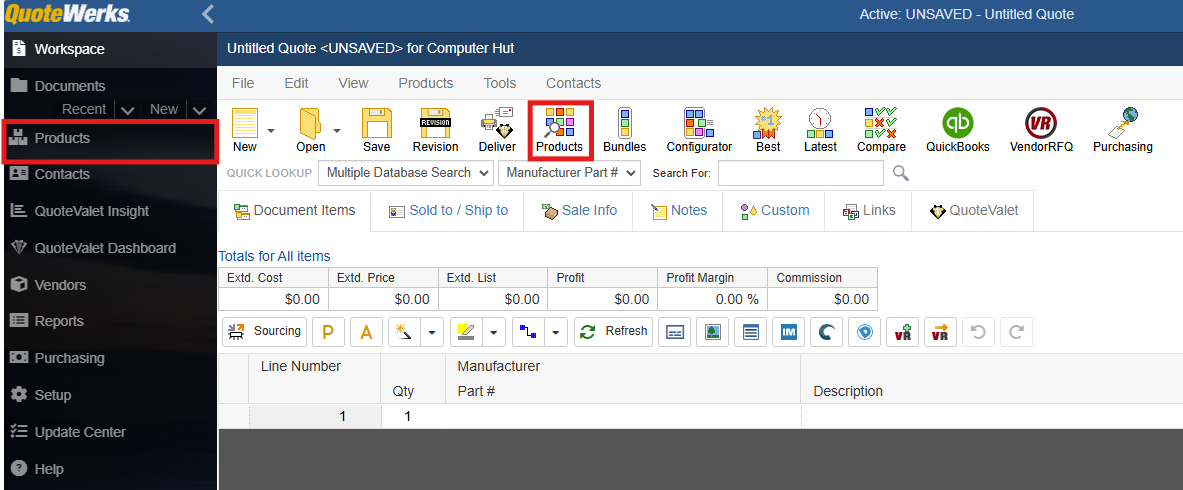 6. Now that we have our contact added, we can click back into the document items tab and start populating our quote with some products. To add products to your quote, click on the product icon or products on the left navigation panel. This opens the products window where you can search your configured product data sources.