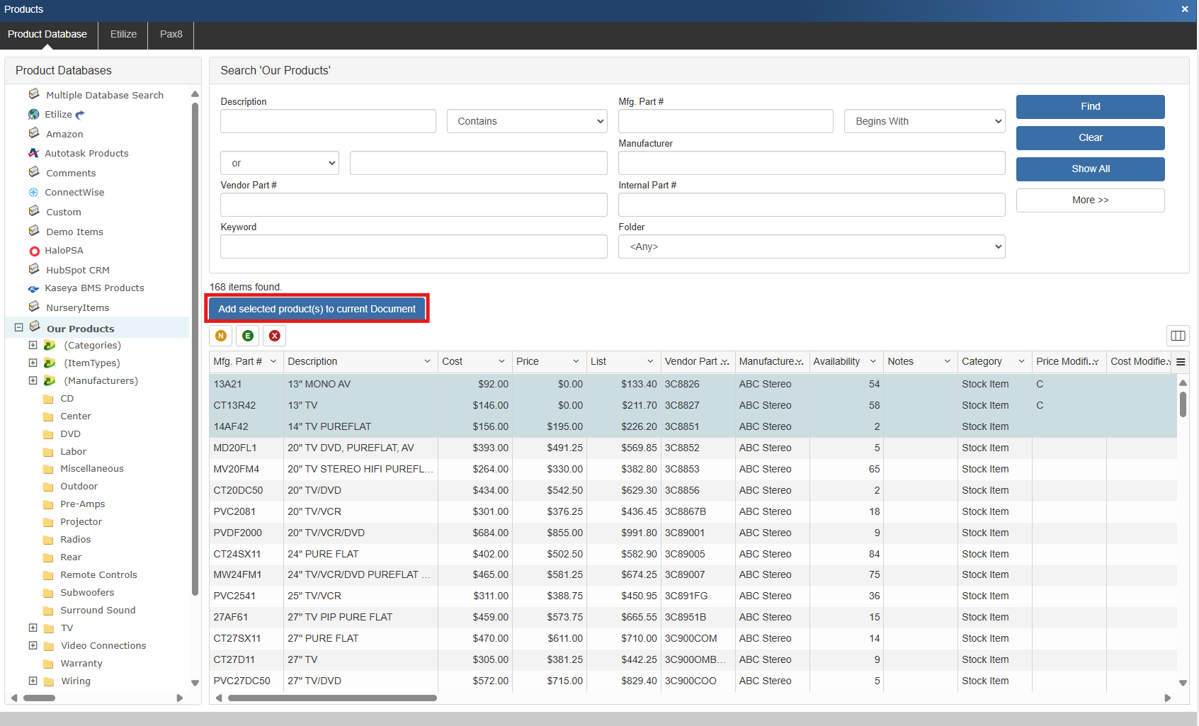 7. To add an item to the quote, simply double click on the item or select it and click on "Add selected products to current document." This opens the add item assistant window.