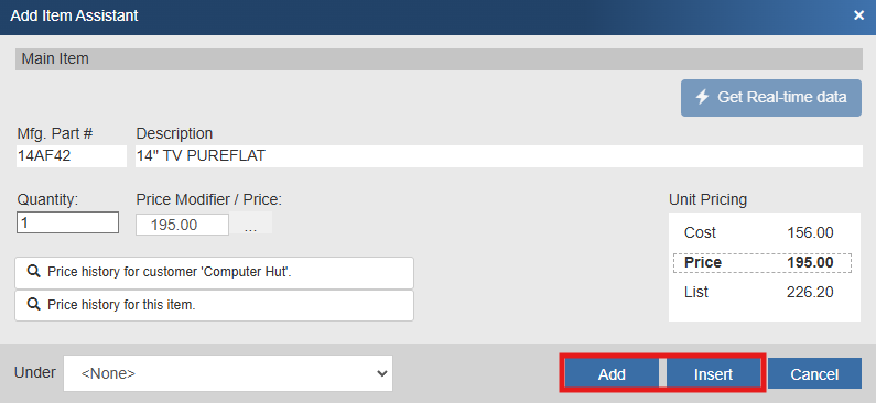 8. Here you can adjust the quantity to be included in the quote, set your pricing, or even check to see what you've sold this product for in the past. Clicking add or insert will add or insert the item to the quote respectively.