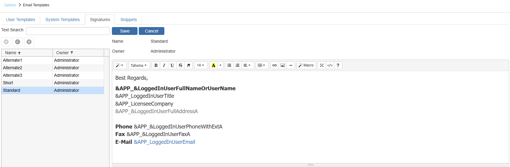 The Standard Signature is the signature you use for the majority of your correspondence. This signature typically has all of your company contact information as well as your contact information contained in the email and any other information you wish to include. The Email signature macro for the Standard Signature is <<SignatureStandard>>. Using this macro in an email template will activate that signature for that template rather than the signature selected as active.
