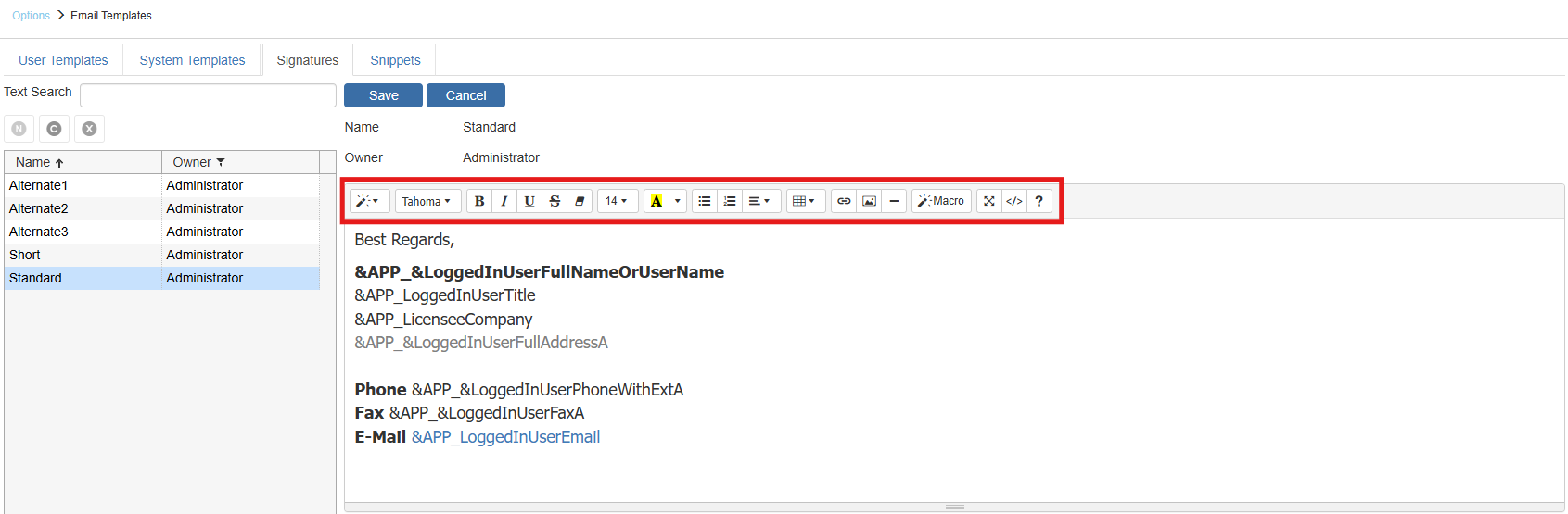 These signatures offer you a way to easily switch the signature in an email. This feature is exceptionally useful if you have multiple business or multiple titles within the same business, you can easily switch signatures with the correct contact information. The Email signature macros for the Alternate Signatures are <<SignatureAlternate1>>, <<SignatureAlternate2>>, and <<SignatureAlternate3>>. Using one of these macros in an email template will trigger the Alternate Signature for that specific template.