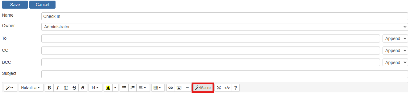 The To, CC, and BCC fields enable you to set default email addresses for specific templates. This is very useful if you want the sales manager BCC'd on every quote that goes out or maybe you need purchasing automatically CC'd when you are sending a payment request email. This feature makes it very easy to automatically default email addresses for specific email templates in your installation. You can also utilize macros in these fields.