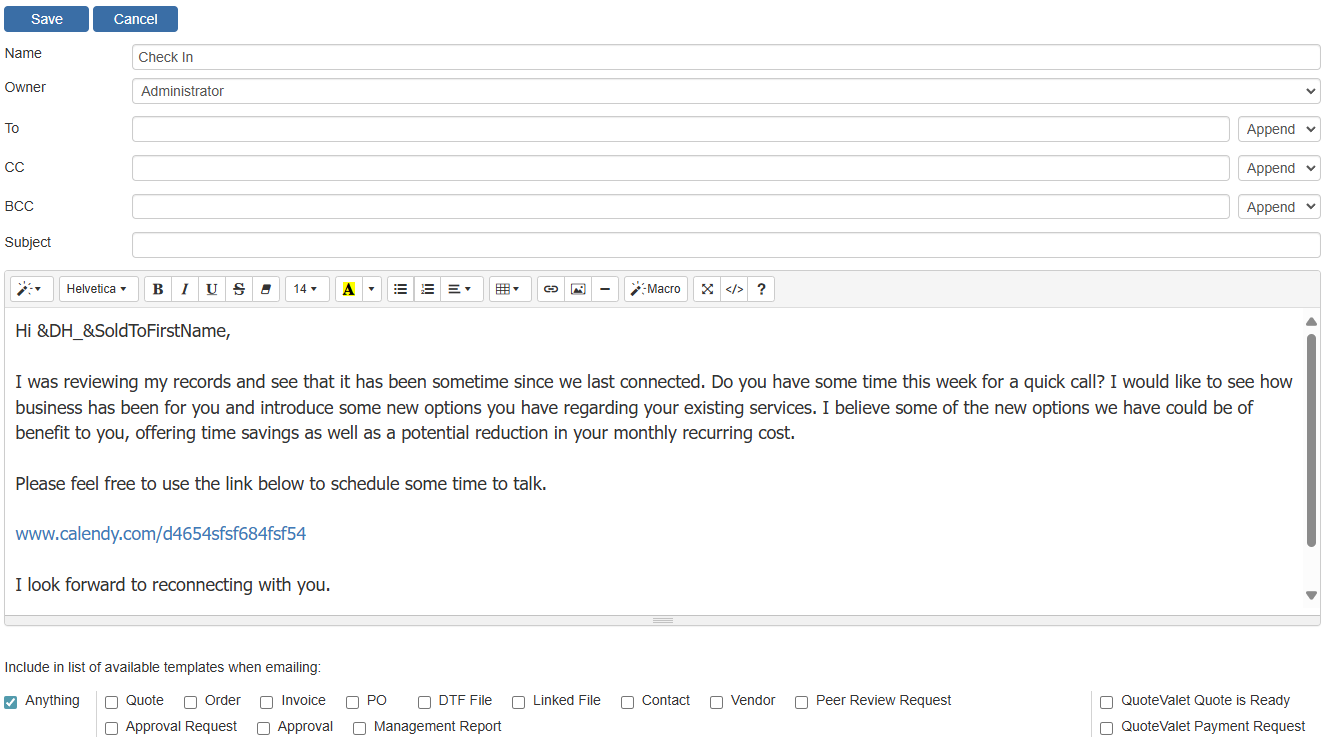 Checking this box will enable this template to be selected when emailing a QuoteValet Quote to your customer.