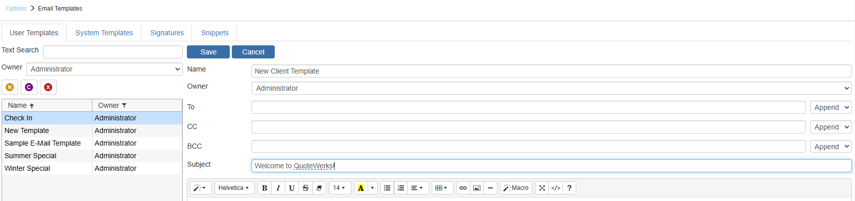 After the template has been created you will be able to change the name, add a default subject for the template, assign it to the proper owner (if not already done), and much more. You will also now be able to save the template and any changes by clicking on the save button.