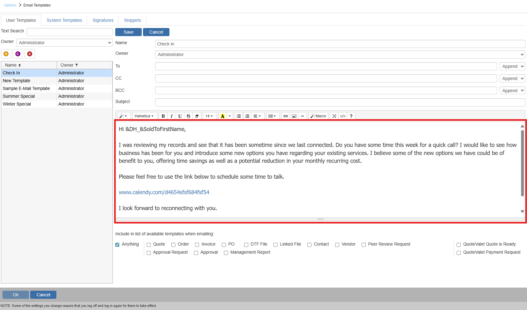 Checking this box will enable this template to be selected when creating any type of email in QuoteWerks.