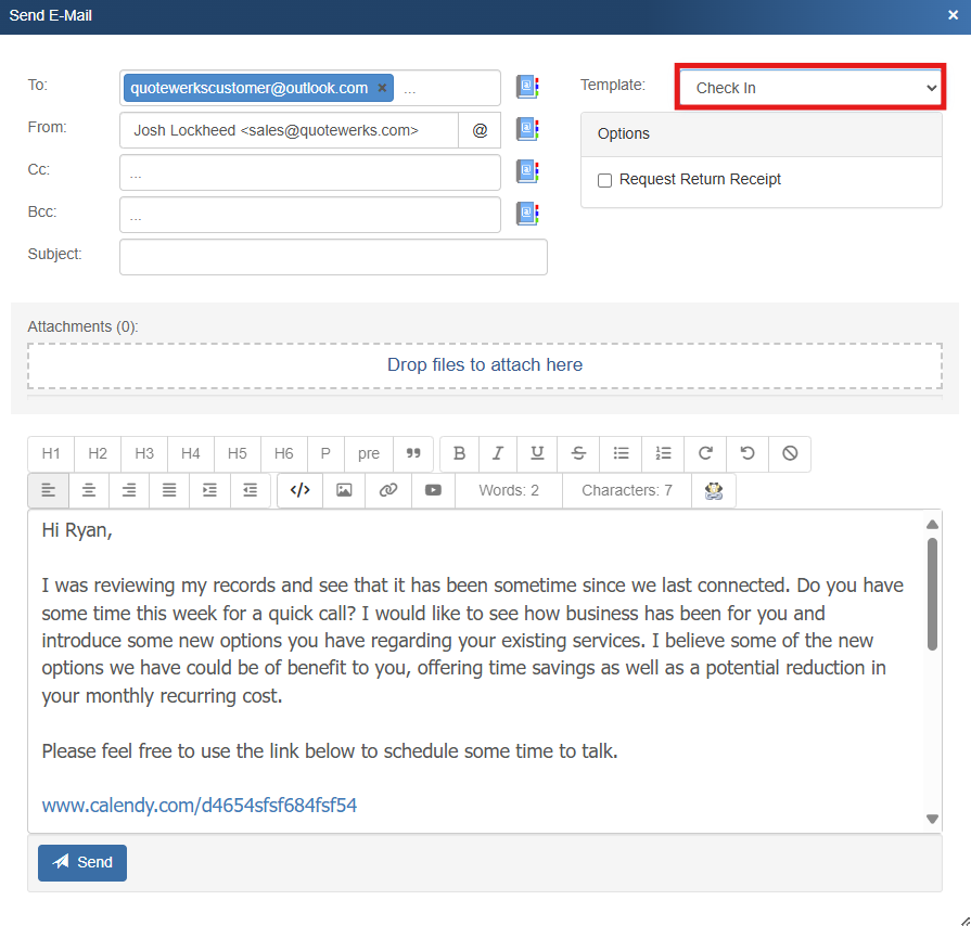 To use a created email template, open the send email window in QuoteWerks. On the right hand side of the window next to the To address selection field, there is a drop-down box: